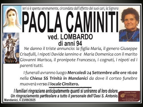 Necrologi Con questo link vogliamo dare l'ultimo saluto ai nostri concittadini che purtroppo ci lasciano e nello stesso tempo vogliamo fornire la notizia dell'avvenuto decesso. La morte rappresenta l'unico evento certo e democratico nella vita di ognuno di noi. Rappresentando per la nostra Comunità un momento sociale di tristezza abbiamo ritenuto opportuno condividere la notizia anche con i mandanicioti sparsi per il mondo. Ci limiteremo a inserire soltanto gli annunci funebri che abbiamo reperito affissi lungo le strade e ci auguriamo che siano pochi gli annunci che andremo a mettere sul sito. I nostri concittadini all'estero, qualora lo volessero, potrebbero inviarci notizie analoghe.